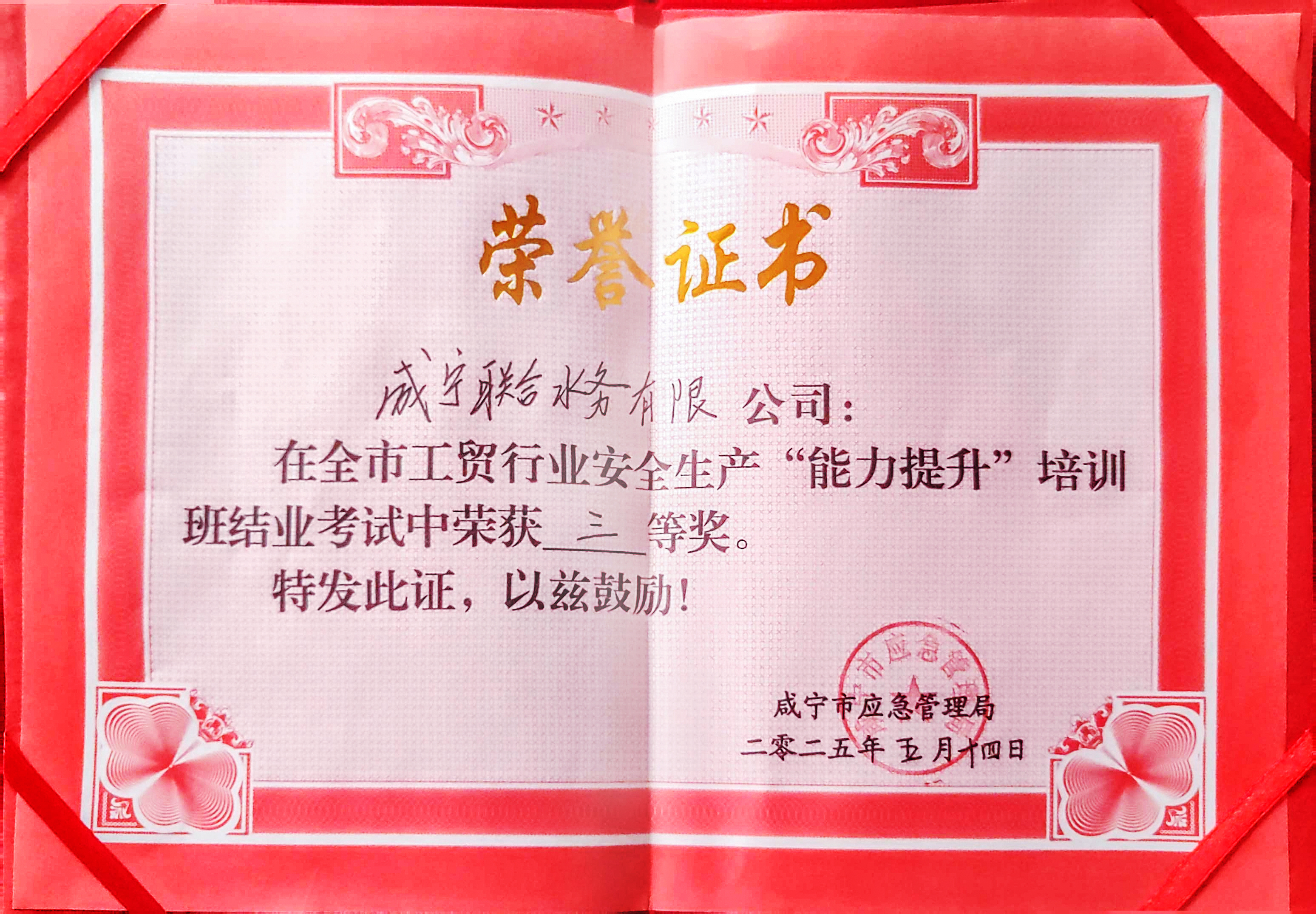 | 喜報|咸寧聯(lián)合水務(wù)員工榮獲咸寧市工貿(mào)行業(yè)安全生產(chǎn)“能力提升”培訓(xùn)班結(jié)業(yè)考試三等獎 | ||
